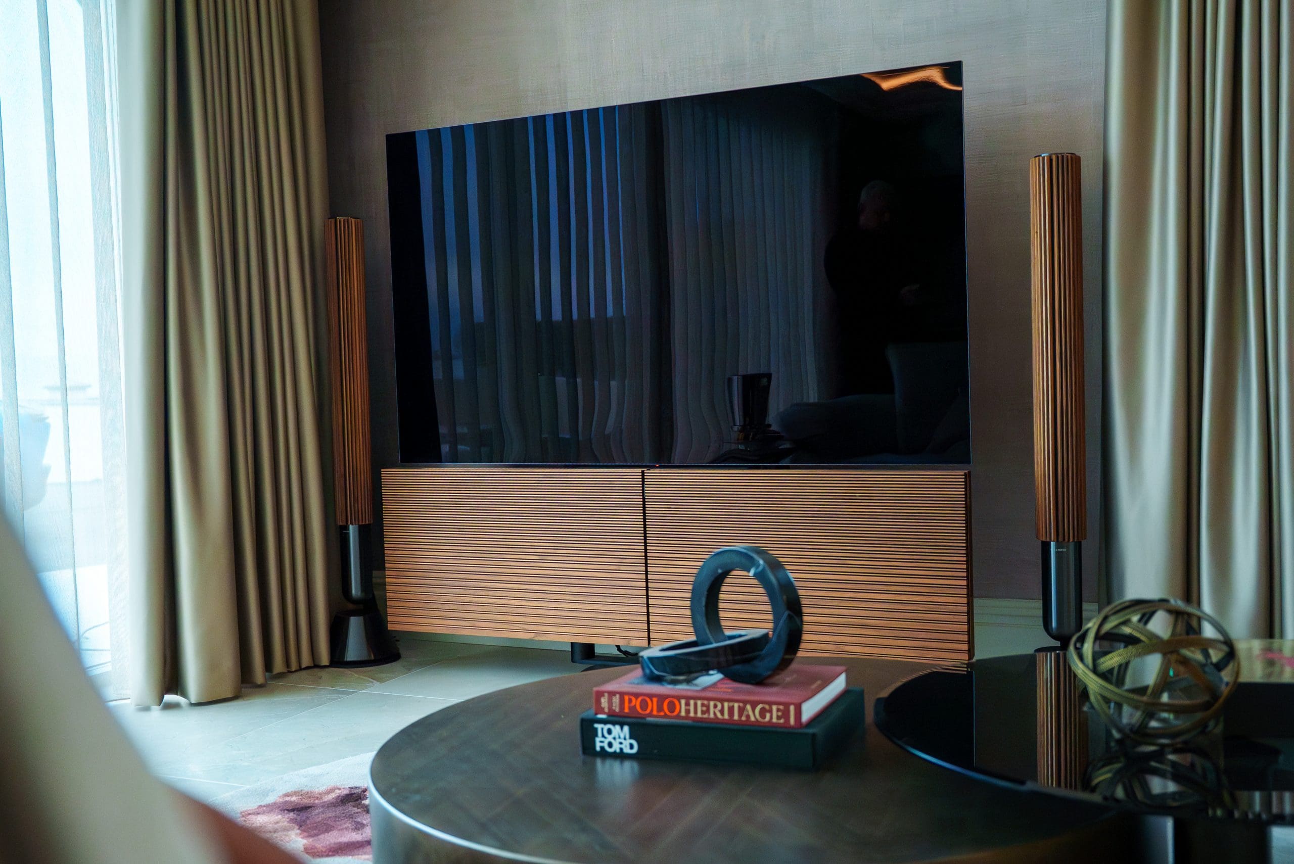 Installed a custom-finished BeoVision Harmony TV in a stunning bronze tone — a true statement piece. When powered on, the sculptural speaker panels unfold dramatically to “start the show.”