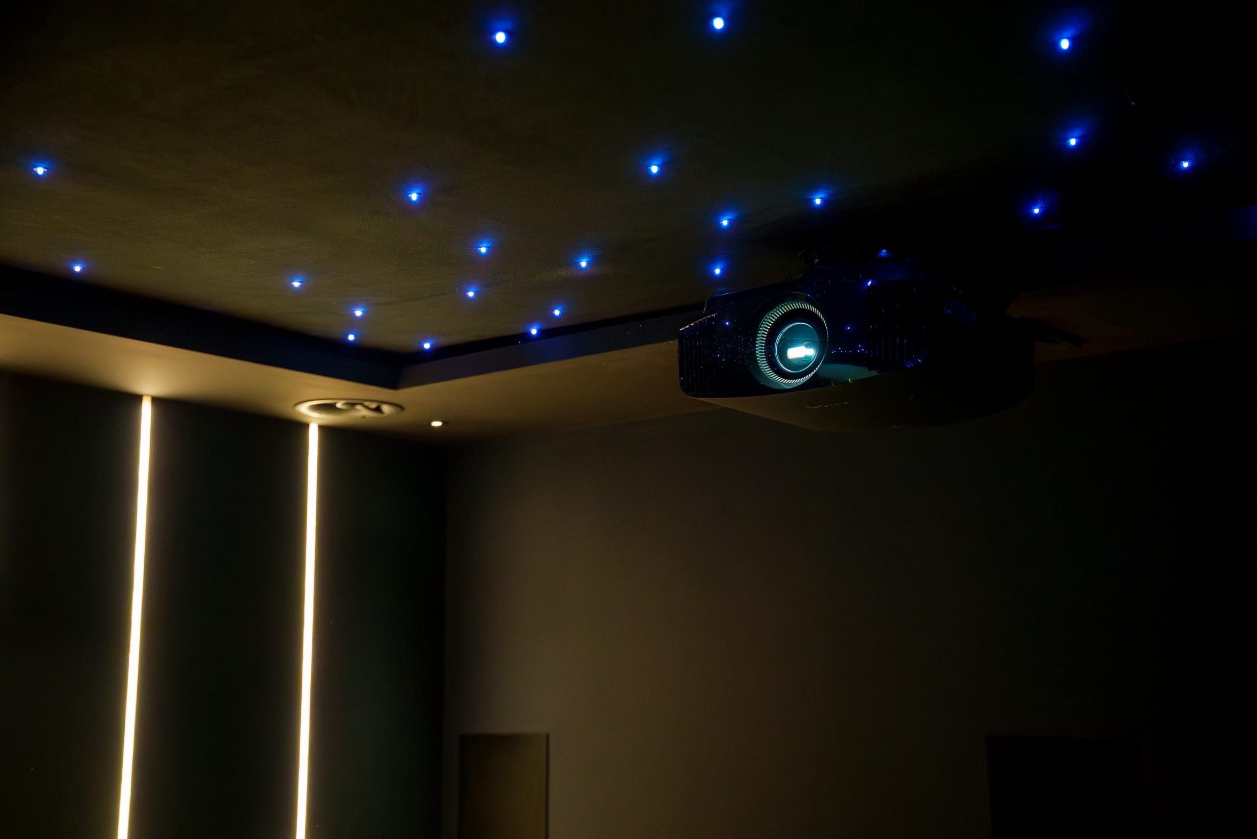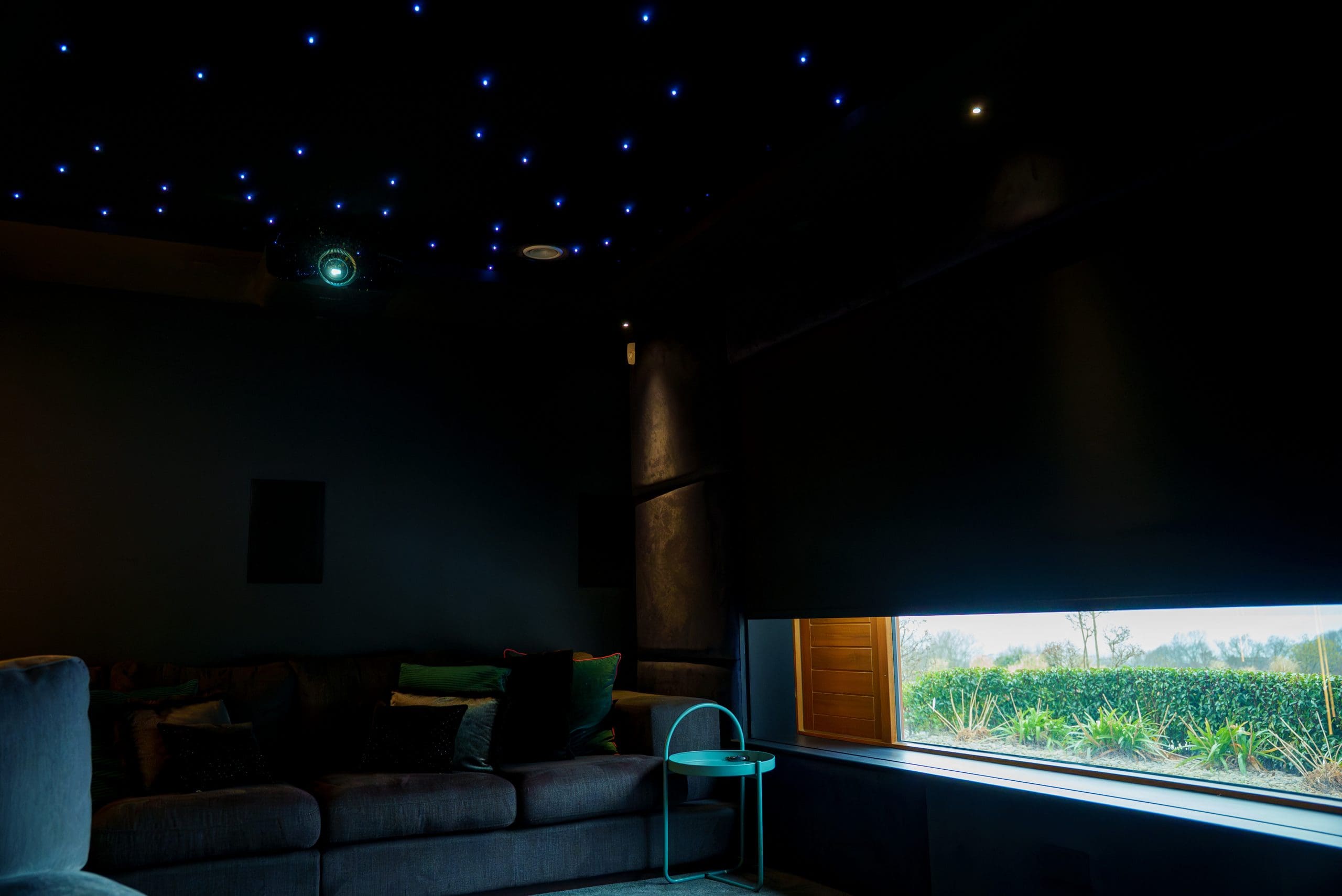 In the cinema room, Triad speakers, a Sony projector, and a Dragonfly projector screen deliver a true home cinema experience. When the projector is switched on, Control4 automatically lowers the Lutron blackout blind and dims the lights, setting the perfect scene. -