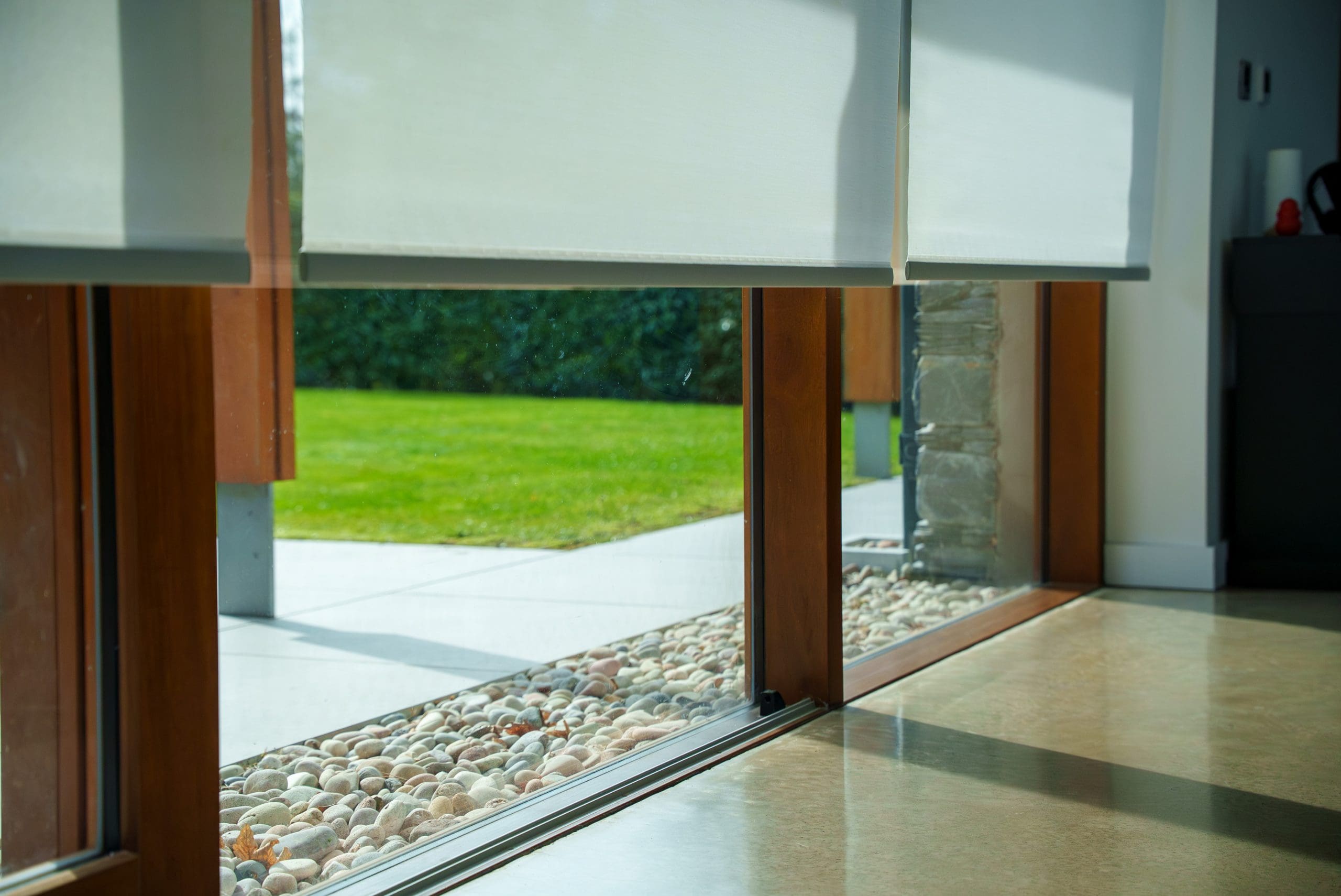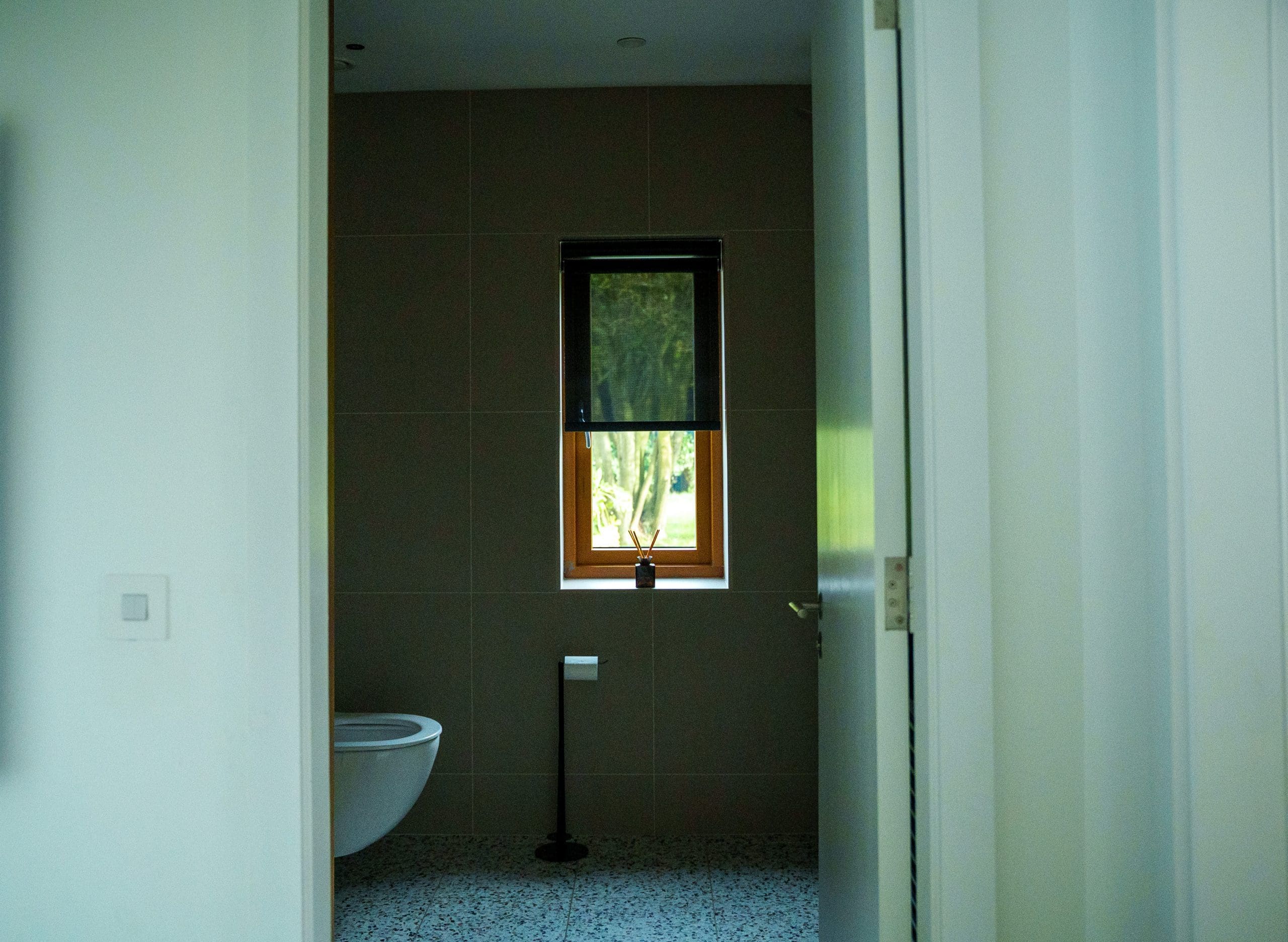 A wireless, battery-operated blind was retrofitted to the downstairs bathroom using a Lutron Pico wireless keypad, delivering smart shading without rewiring—perfect for added privacy where it was later needed. -