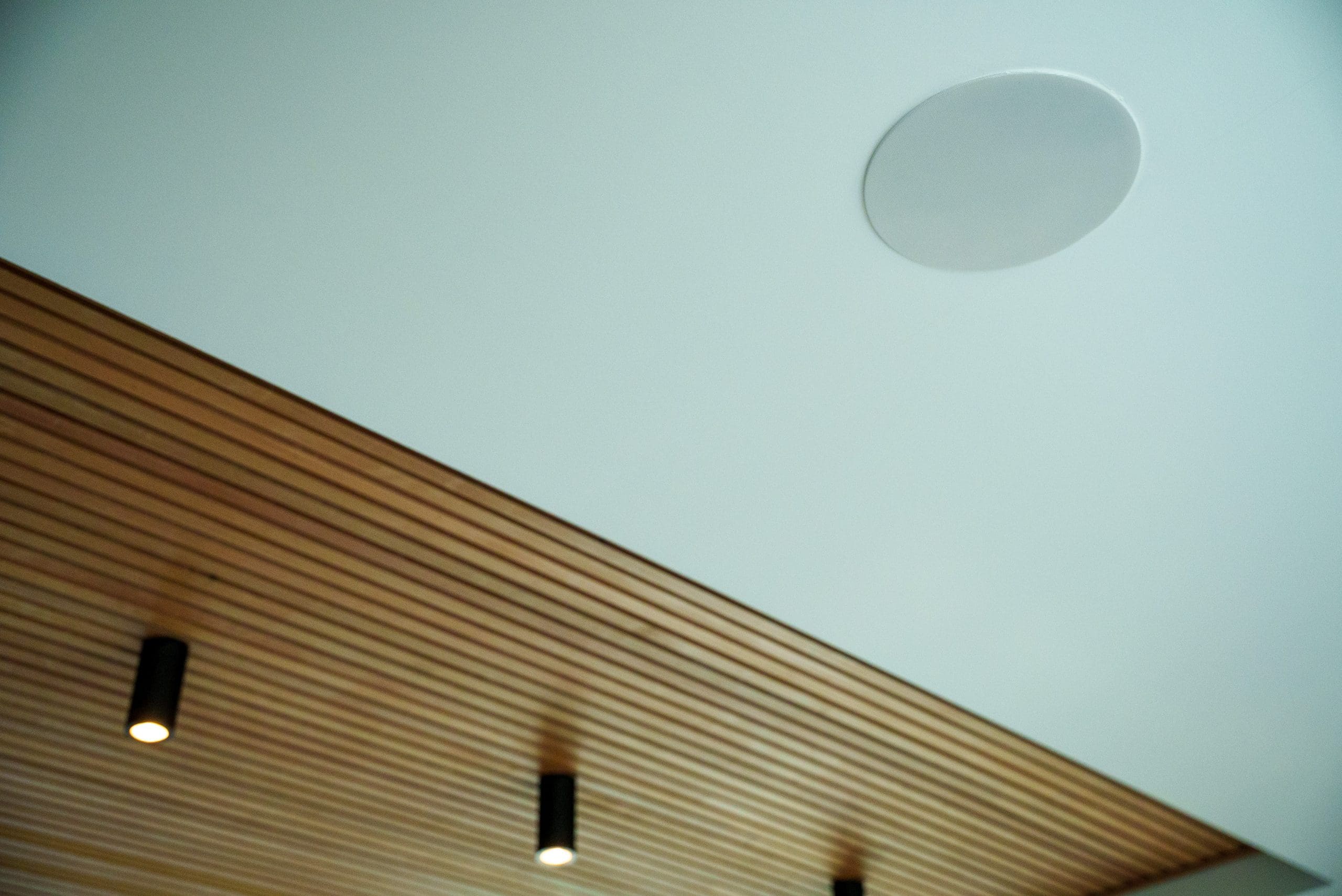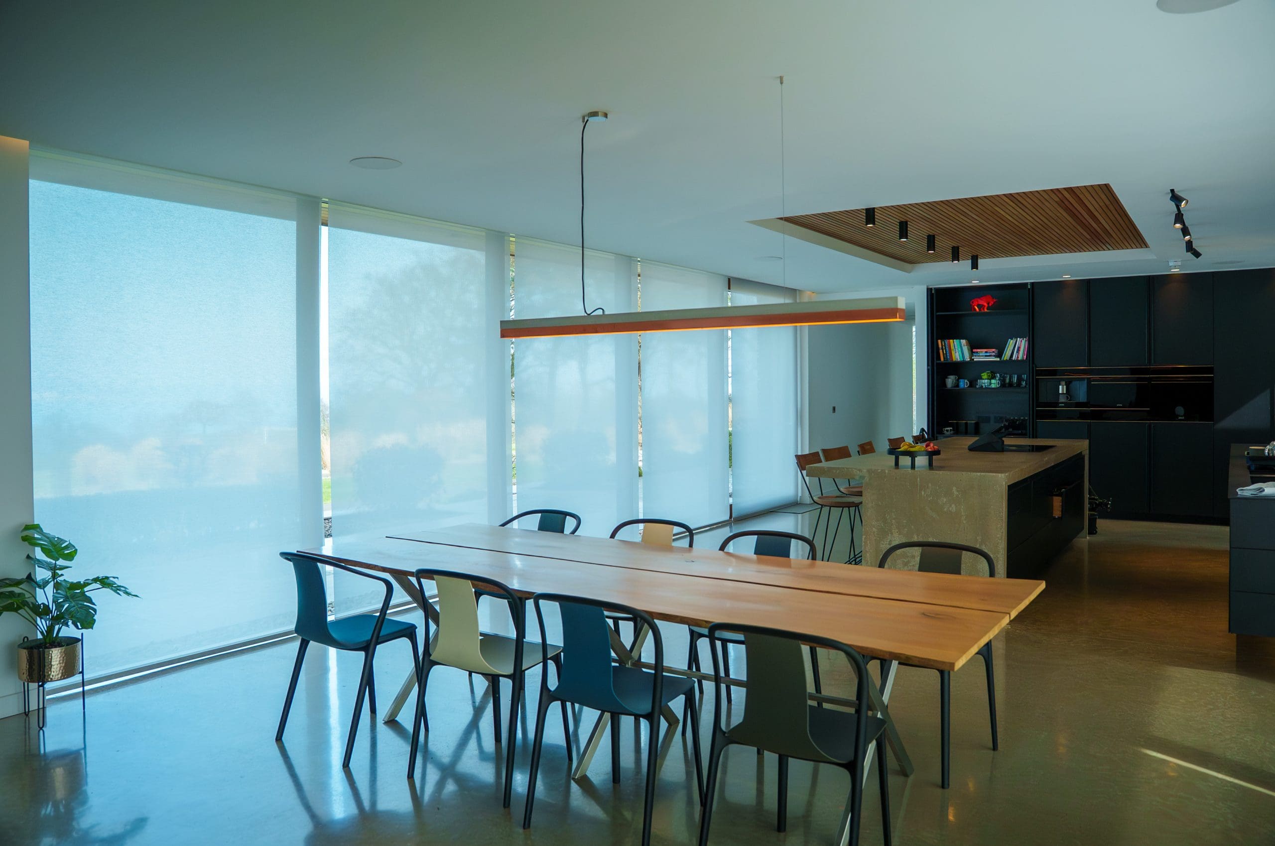 Control4 automation powers the entire AV and smart tech ecosystem. In the kitchen/living area, Triad ceiling speakers allow streaming from personal devices or a central remote that controls audio, lighting, blinds, CCTV, and the front gate. -