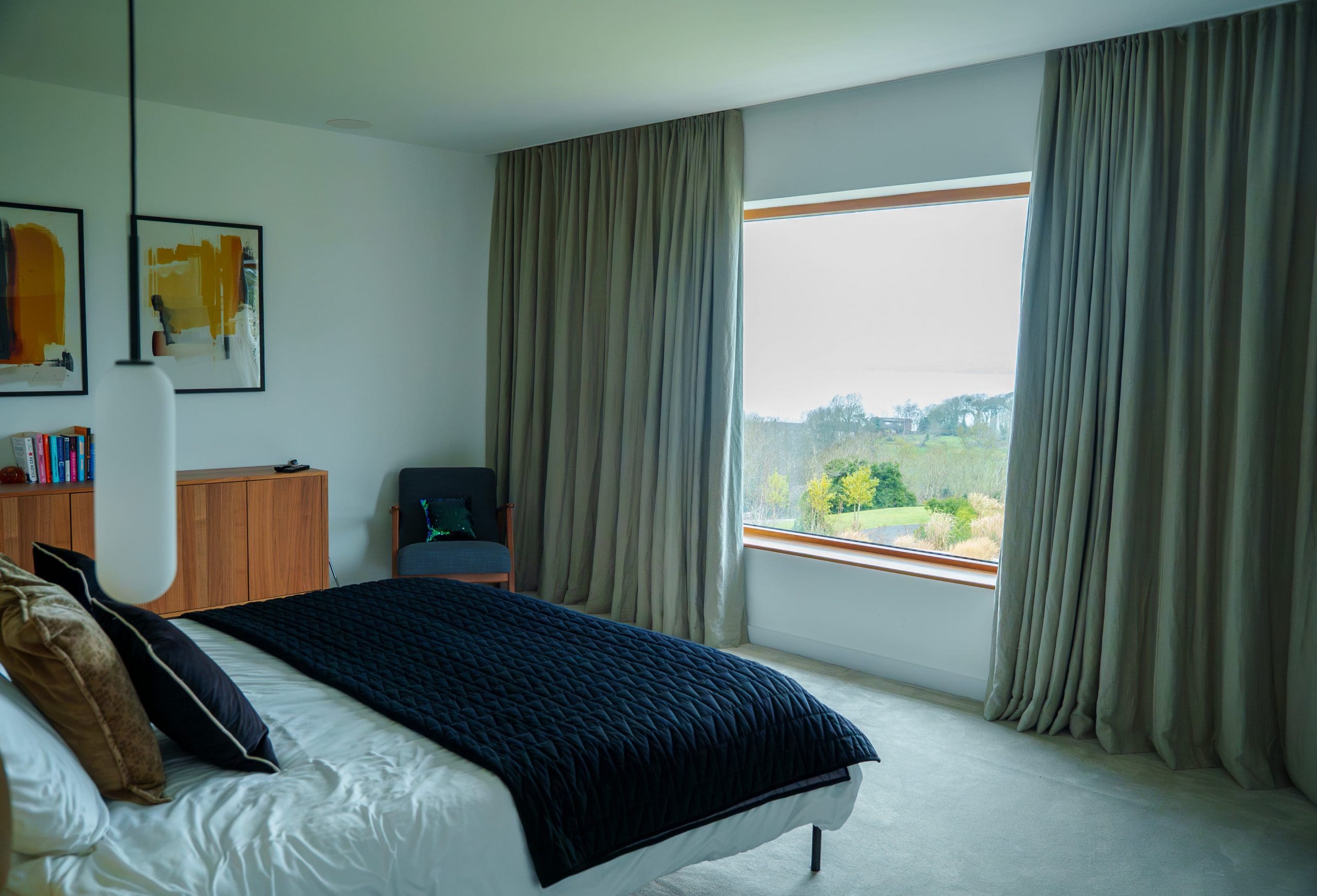 The Master Bedroom features both Lutron sheer blinds and room-darkening motorised curtains, controlled via bedside keypads. A single “Good Night” button switches off all lights downstairs—offering peace of mind from the comfort of bed. -
