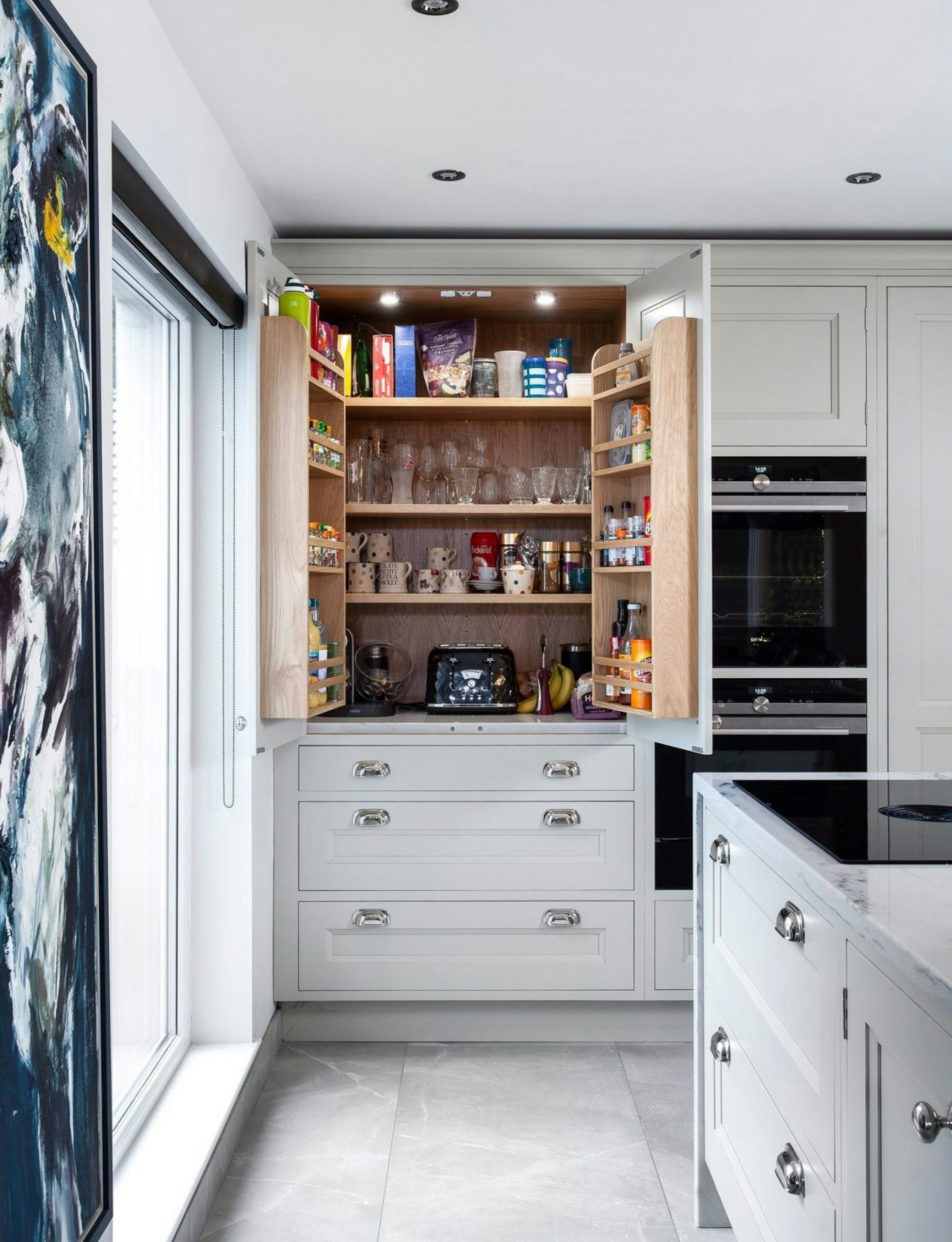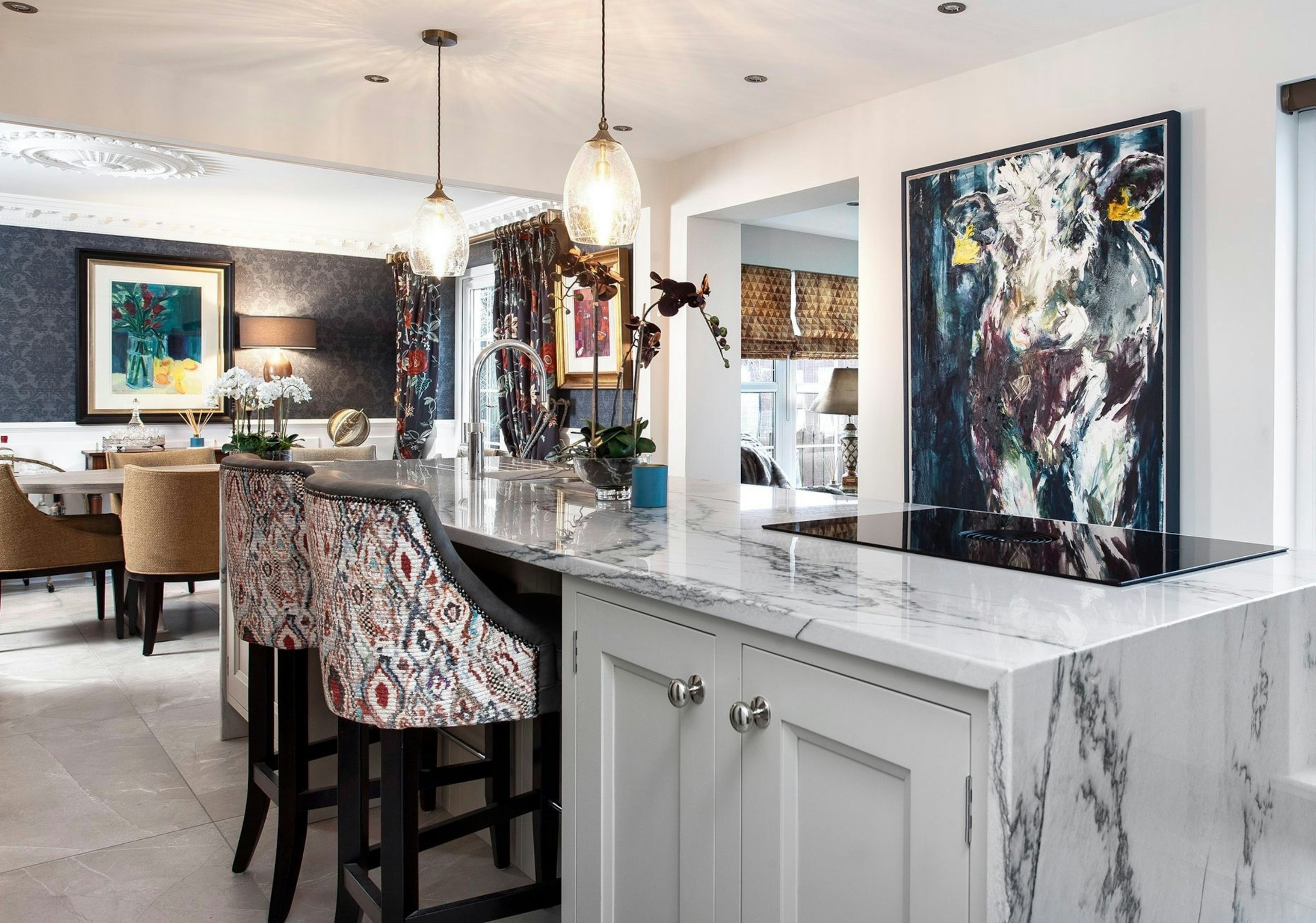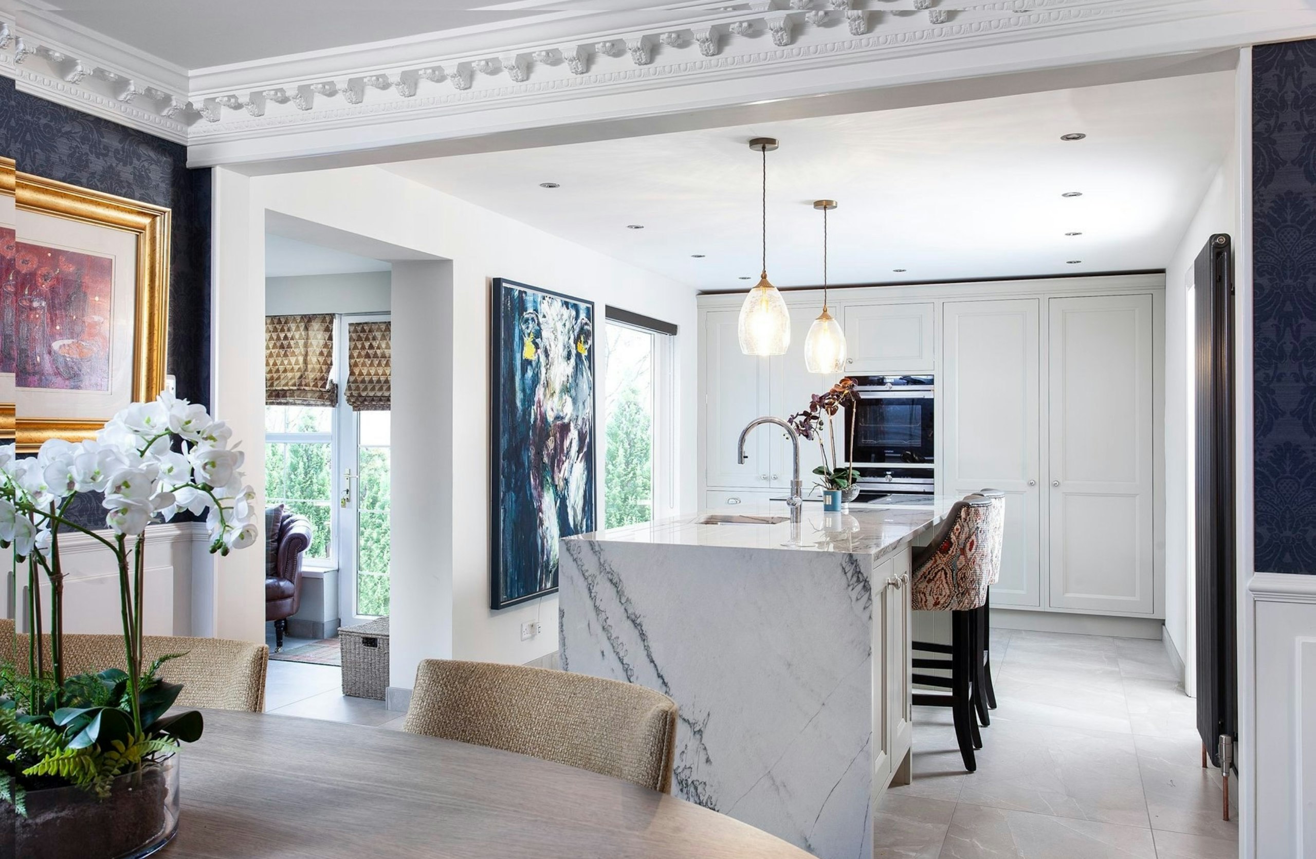 This kitchen dining area exudes timeless elegance with its traditional elements. In the centre of the space, a stunning marble waterfall kitchen island serves as the focal point. Its sleek design and smooth surface add a touch of luxury to the room. Surrounding the island, bespoke furniture complements the overall aesthetic, showcasing intricate detailing and exquisite craftsmanship. The combination of traditional elements and contemporary design come together to create a truly breathtaking kitchen dining area that merges classic charm with modern sophistication.