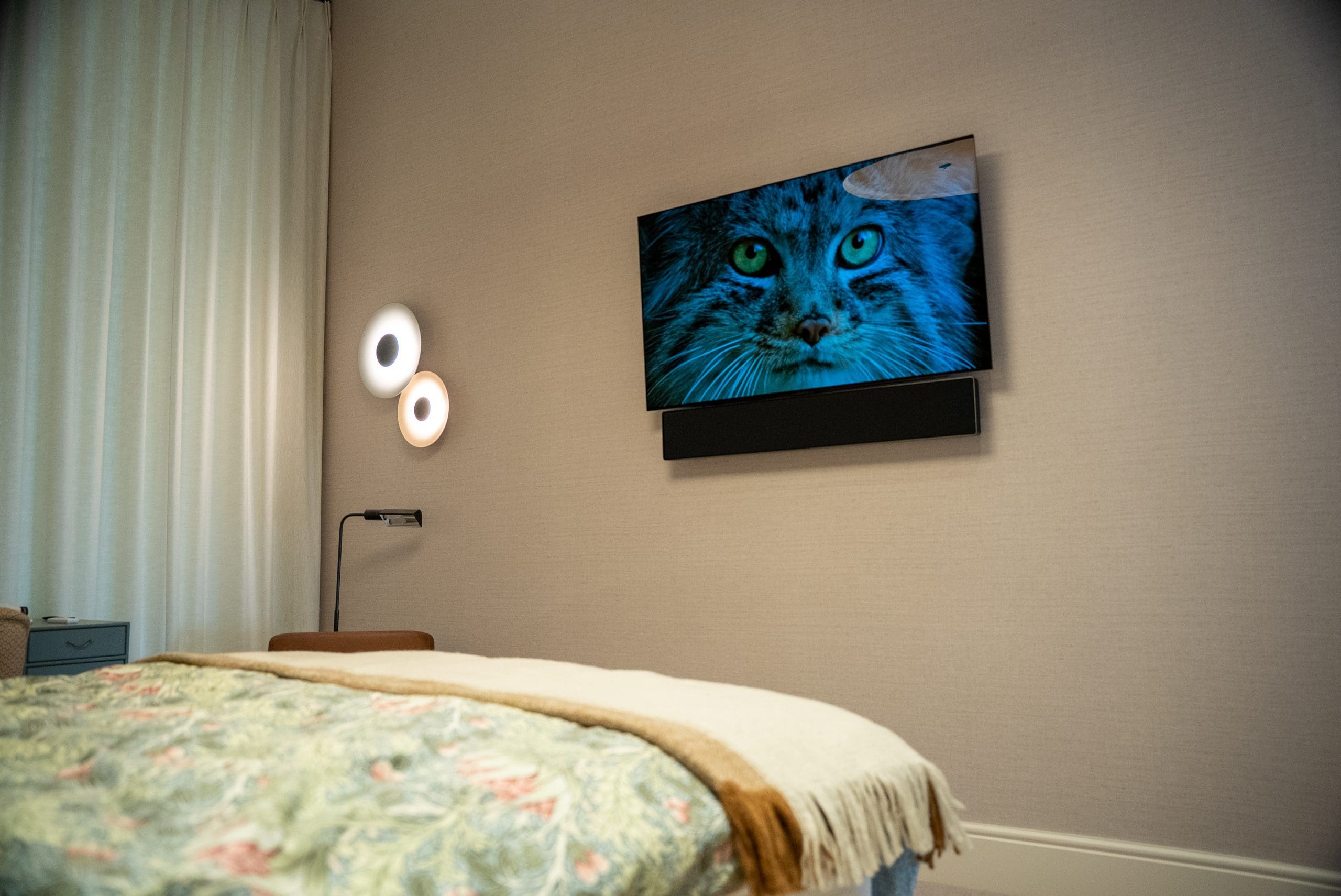 For rear surround sound, we used BeoLab 18s, known for their slim profile and iconic look, alongside a BeoLab 19 subwoofer (discreetly hidden out of sight). Thanks to WiSA wireless technology, these speakers only needed a power connection — no messy cabling, no hassle.